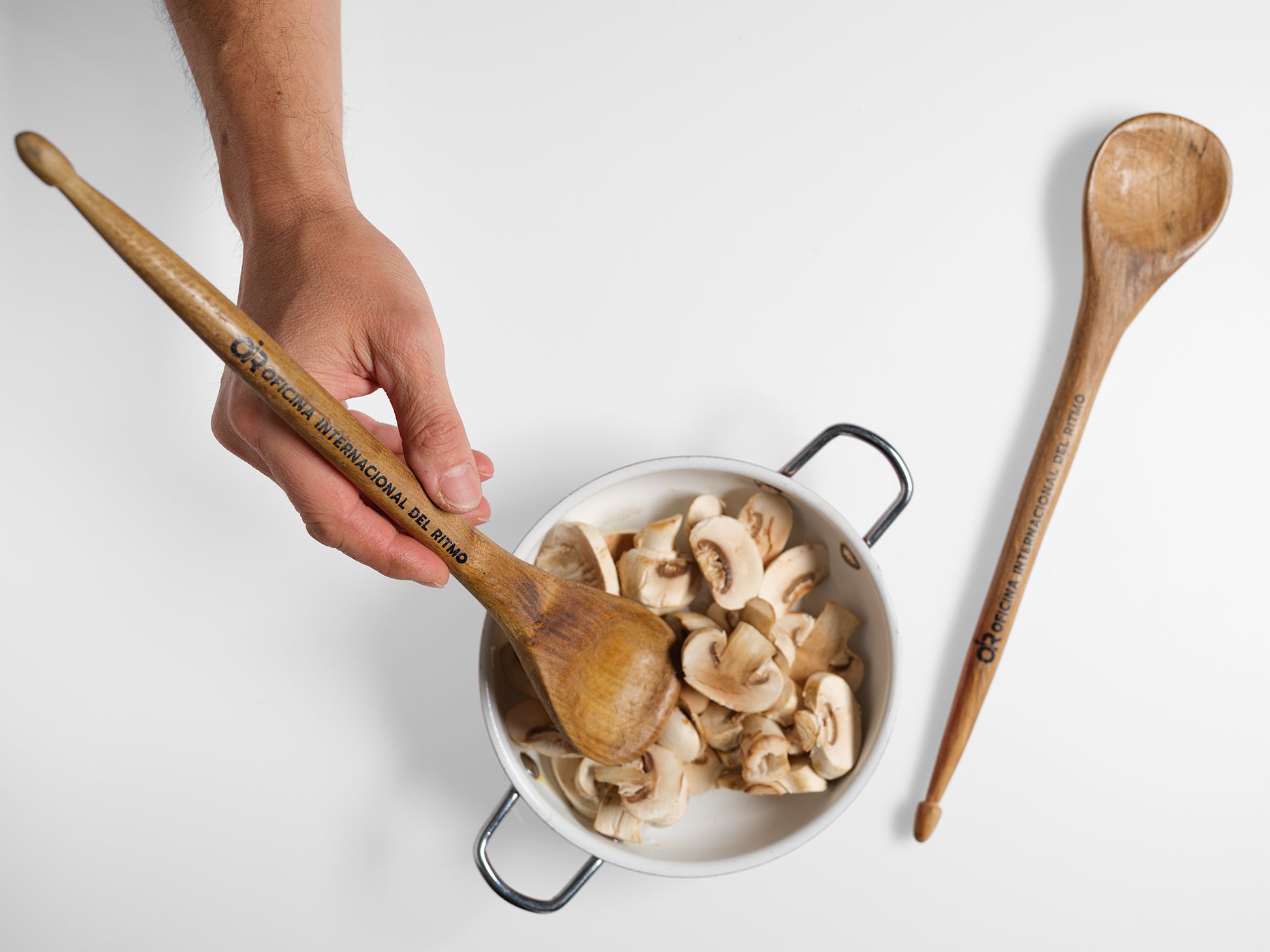 Inscrito con el Logo de "OiR" en la cuchara y serigrafiado "Oficina Internacional del Ritmo" en la baqueta.